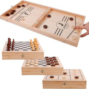 4-in-1 Wooden Fast Sling Puck Set for Kids and Adults, Chess, Checkers, Tic Tac Toe Games, Travel Portable Folding Tabletop Chess Board Game Sets, Interactive Families Toys