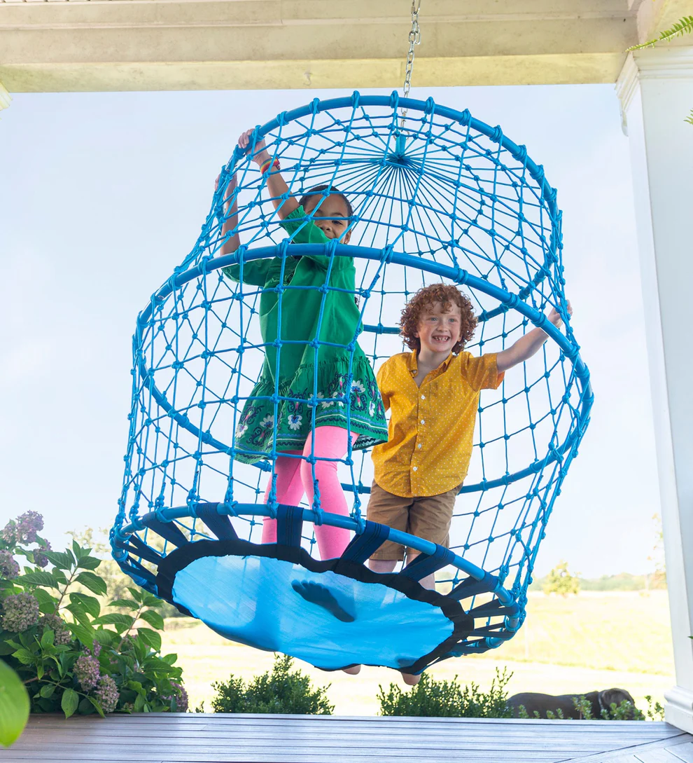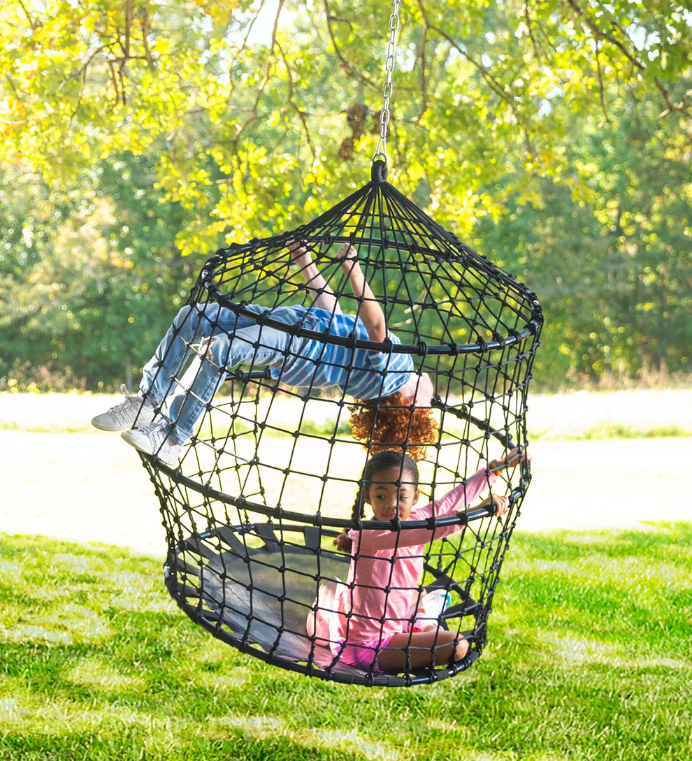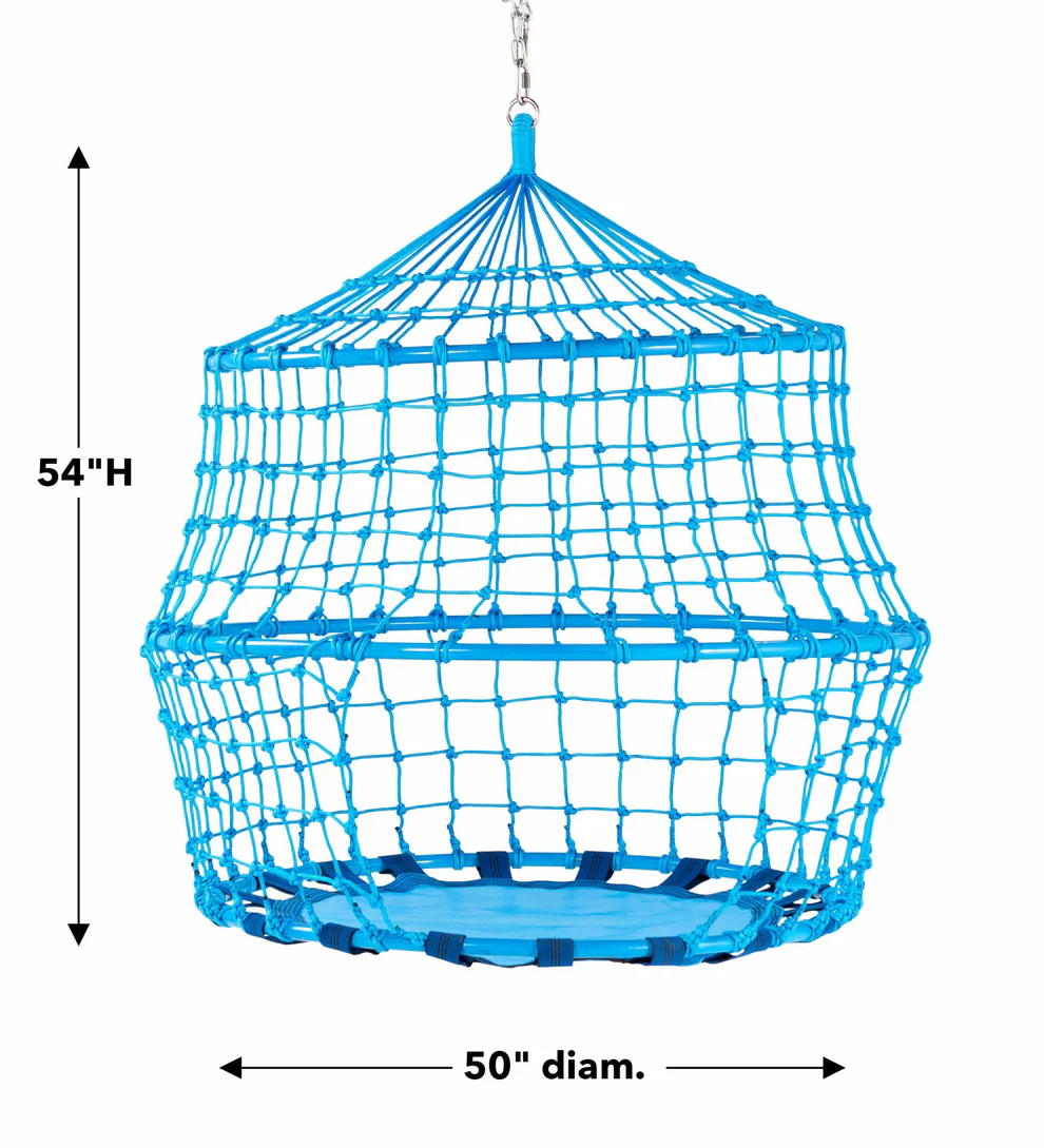 Available in 2 colors (blue or black), the sturdy rope construction adds breathability and visibility to this 50″ diam. x 54″H unique hanging play space (part swing, part rope tunnel, part hanging tent), and the wide opening provides easy entry and exit. A 40″ diam. comfy Textilene swing mat extends along the base of the structure, supporting two kids (up to 450 lbs).