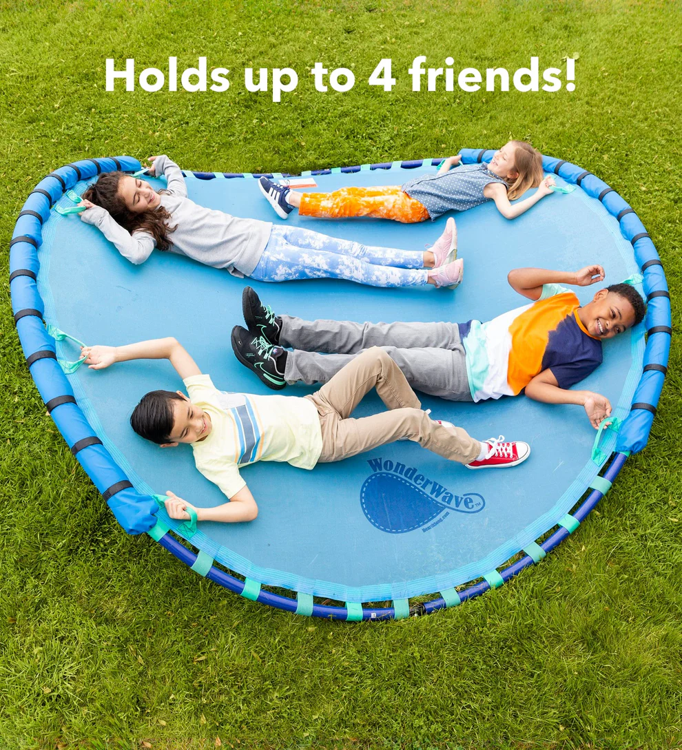 Make your backyard the “place to be” with our unique, exclusive WonderWave® Rocking Seesaw! Everyone will ask, “Where’d you get that?” We’ve made our original “Potato Chip” teeter totter even better (and easier to assemble) than ever with redesigned hinges and a sturdy metal frame. Thick foam padding and 8 handles offer comfort and safety while rocking’ and rollin’ in the backyard. The durable, quick-dry, weather-resistant polypropylene mat stands out in your yard with its new bright blue color.
