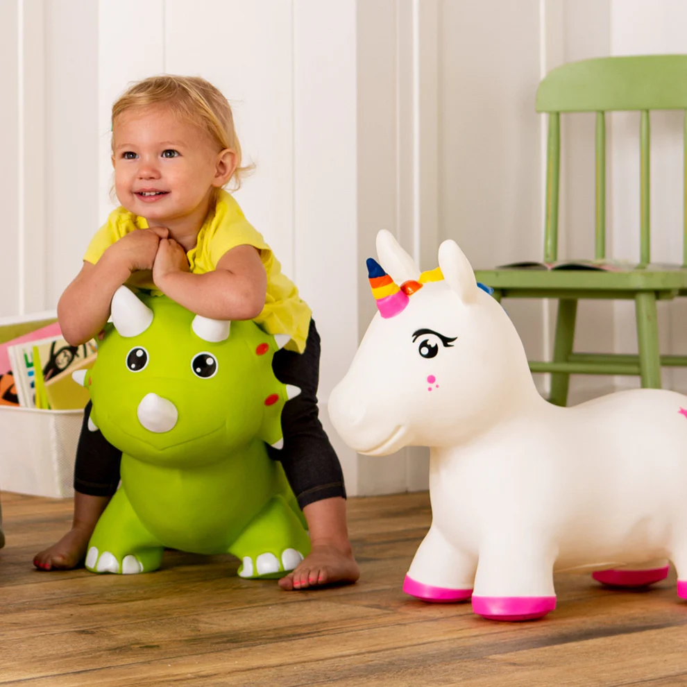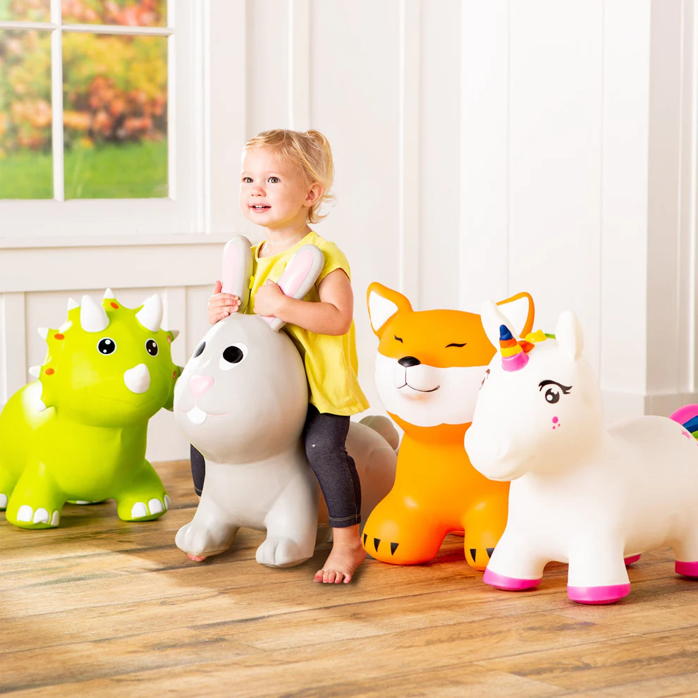 Be not only the leap-iest hopper, but also wonderful pal, all with your Hearthsong Bouncy Inflatable Animal Jump-Along. The 28”L x 13.5”W x 17.5”H vibrant, friendly, and bouncy animal boasts tough, heavy-duty yet soft body with durable feet and easy-to-clutch ears to ensure the safest, most lasting, and bounciest jump-capade! And while you hippity-hoppity hop, horn in on your strength, balance, and coordination. Name your new bouncy companion on its birth certificate and invite other hoppers to join in on the fun!